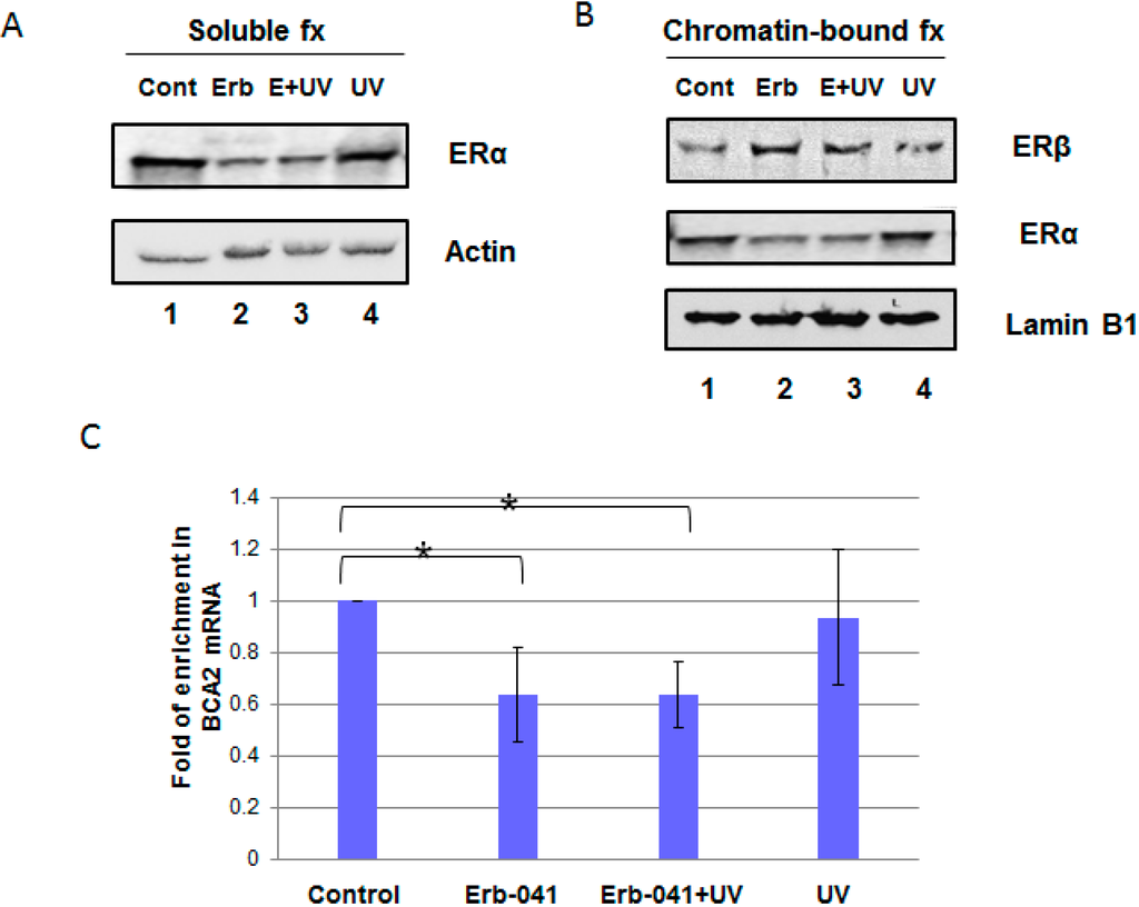 To characterize the effect of Erb-041 on ERα-mediated signaling in MCF-7 cells, we separated cell lysates into soluble and chromatin-bound fractions for protein analysis (Figure 1A,B). We found that 24 h incubation with Erb-041 not only decreased chromatin-bound ERα (Figure 1B, lane 2 vs. lane 1) but also diminished UVC-induced chromatin association of ERα in MCF-7 cells (Figure 1B, lane 3 vs. lane 4). In contrast, chromatin-bound ERβ was increased by Erb-041 in the absence or presence of radiation (Figure 1B, lanes 2 and 3 vs. lane 1). Concurrently, the levels of BCA2 transcripts were decreased by Erb-041, suggesting the ERβ agonistic effect of Erb-041 antagonizes ERα-mediated BCA2 transcription (Figure 1C). These results indicate that Erb-041 reduces ERα chromatin association and BCA2 transcription.