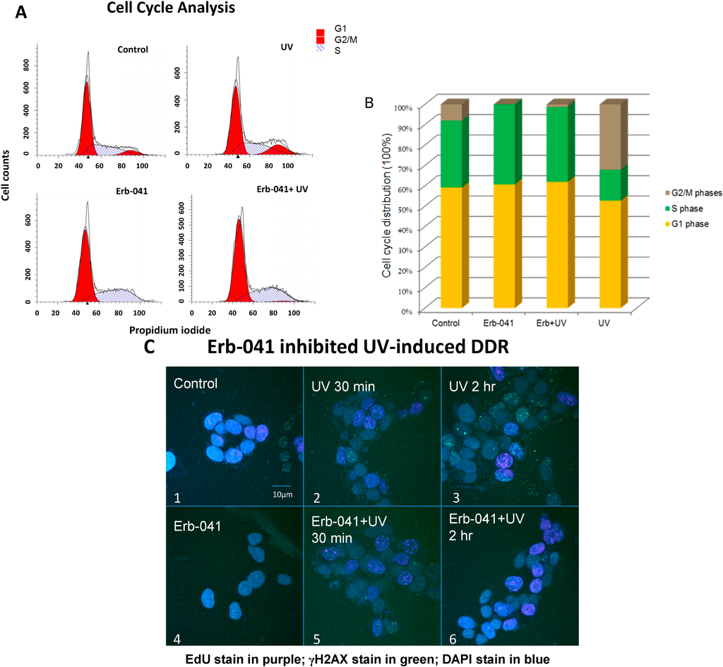 Erb-041 mediated cell cycle arrest in S phase and potentiated UV-induced DNA synthesis (A) MCF-7 cells were treated with Erb-041 for 24 h prior to UVC irradiation. After irradiation, exponentially growing cells were further incubated for 24 h prior to overnight ethanol fixation. The amount of DNA in each cell was measured by FACS after propidium iodide staining; (B) Quantitative analysis of the cell cycle distribution in the setting described in (A); (C) DNA synthesis and damage were assayed by immunofluorescence staining with the nucleotide analog, EdU, as well as anti-γH2AX antibody. After being treated with Erb-041 for 24 h, cells continued to undergo 30 min EdU incorporation, which was terminated by PBS wash and medium replacement. Cell irradiation was then carried out prior to fixation and subsequent incubation with anti-EdU reaction buffer, anti-γH2AX antibody, the designated fluorophore antibody and DAPI. EdU incorporation was represented by the purple fluorescence of Alexa Fluor 647 while γH2AX foci and the cell nuclei were indicated by the green fluorescence of Alexa Fluor 488 and DAPI, respectively. Description of experimental conditions: image #1, cells without any treatment; image #2, cells irradiated by 10J/m2 UVC and incubated for 30 min after irradiation; image #3, cells irradiated by 10J/m2 UVC and incubated for 2 h after irradiation; image #4, cells incubated with 40 μg/mL Erb-041 for 24 h; image #5, cells incubated with 40 μg/mL Erb-041 for 24 h before the UVC irradiation and 30 min post-irradiation incubation; image #6, cells incubated with 40 μg/mL Erb-041 for 24 h before the UVC irradiation and two-hour post-irradiation incubation.