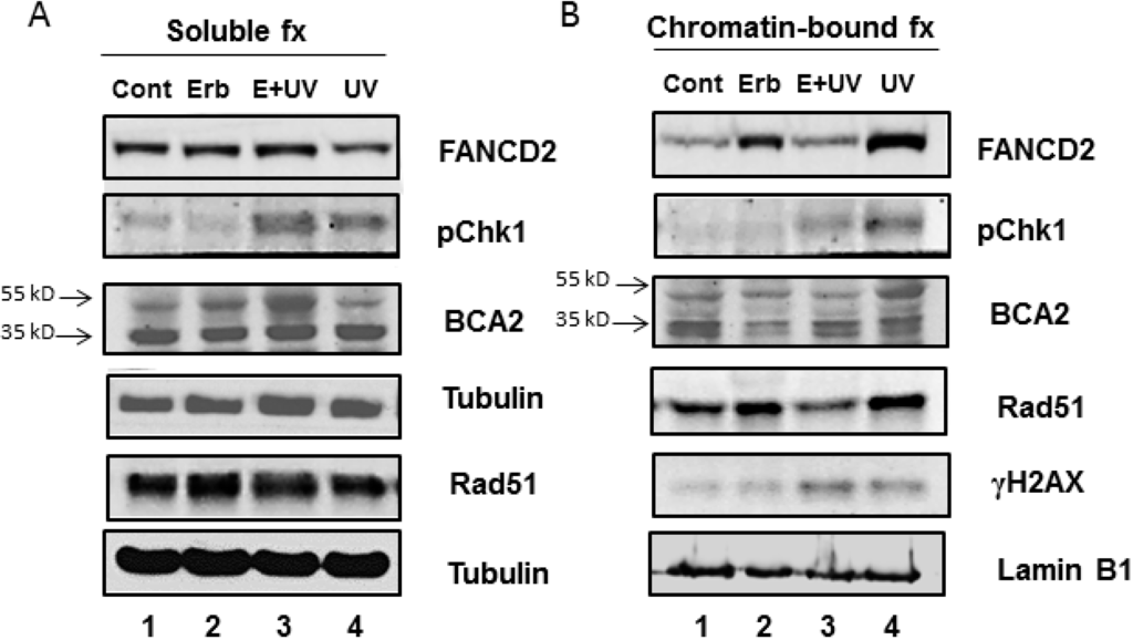 Erb-041 inhibited the chromatin association of BCA2 and reduced UV-induced DDR protein expression. After Erb-041 pretreatment or/and irradiation, exponentially growing MCF-7 cells were lysed and the cell lysates were fractionated and subjected to SDS-PAGE and immunoblotting with the indicated antibodies. Description of experimental conditions: Lanes 1, cells without any treatment (denoted by Cont); lanes 2, cells incubated with 40 μg/mL Erb-041 for 24 h (denoted by Erb-041); lanes 3, cells incubated with 40 μg/mL Erb-041 for 24 h before UVC irradiation at the energy irradiance of 10 J/m2 (denoted by E+UV); lanes 4, cells irradiated by 10J/m2 UVC (denoted by UV). Protein molecular weights at 35 and 55 KD indicate the non-ubiquitinated and polyubiquitinated BCA2.