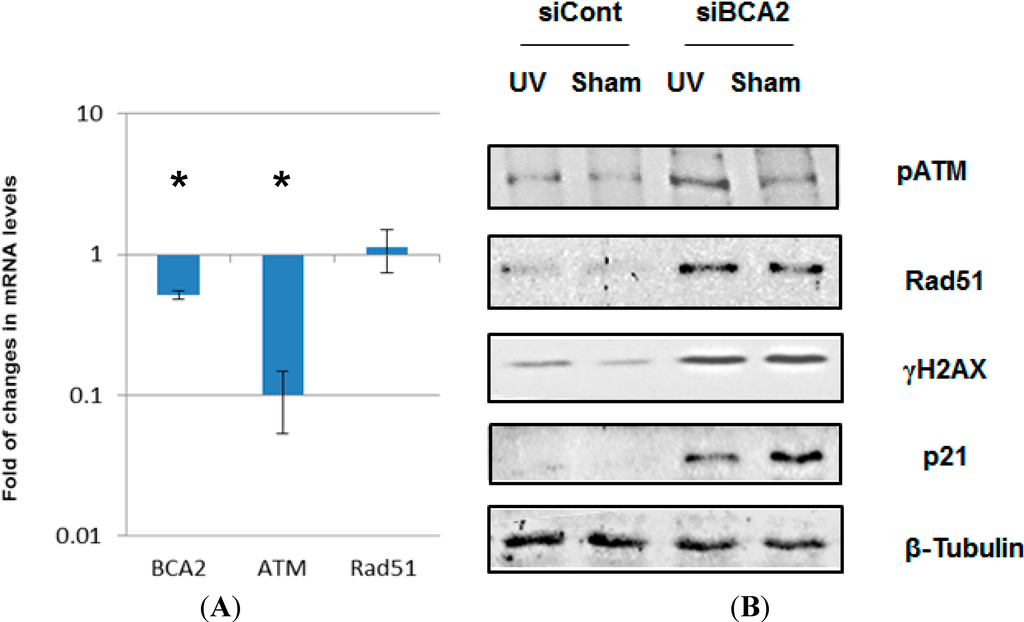 BCA2 knockdown up-regulated several DDR proteins. (A) Transcriptional levels of BCA2, ATM and Rad51 genes were analyzed with quantitative real-time PCR at 72 h post-transfection with scrambled or BCA2-targeted siRNAs; (B) Replicate cultures of MCF-7 cells were transfected with siRNA against BCA2 or non-targeting control siRNA prior to irradiation and post-irradiation incubation. At 2 h post-irradiation, cell extracts were isolated and analyzed by SDS-PAGE and immunoblotting with the indicated antibodies. * denotes significant difference between control siRNA- and BCA2 siRNA-treated groups with p < 0.05.