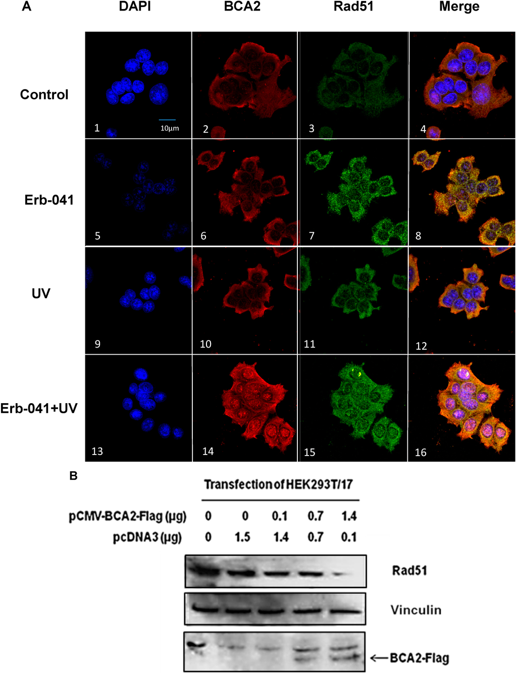 Erb-041 potentiated BCA2 and Rad51 nuclear co-localization in association with ubiquitin-mediated Rad51 degradation. (A) MCF-7 cells under different experimental conditions were fixed and immunostained with anti-BCA2 and Rad51 antibodies prior the staining with Alexa Fluor 488 anti-goat, Alexa Fluor 555 anti-rabbit IgG, and the nuclear stain, DAPI, for confocal microscopic imaging; (B) The pCMV-BCA2-Flag or pcDNA3 vector was transfected into HEK293T/17 cells. The cells were lysed 48 hours later, and the cell lysates were subject to SDS-PAGE and immunoblotting with anti-Rad51, actin and FLAG antibodies. Description of experimental conditions: Control, cells without any treatment; Erb-041, cells incubated with 40 μg/mL Erb-041 for 24 h; UV, cells irradiated by 10 J/m2 UVC; Erb-041+UV, cells incubated with 40 μg/mL Erb-041 for 24 h before UVC irradiation at the energy irradiance of 10J/m2; first-lane images, DAPI immunofluorescence under different experimental conditions; second-lane images, anti-BCA2 immunofluorescence under different experimental conditions; third-lane images, anti-Rad51 immunofluorescence under different experimental conditions; fourth-lane images, merged immunofluorescence under the different experimental conditions.