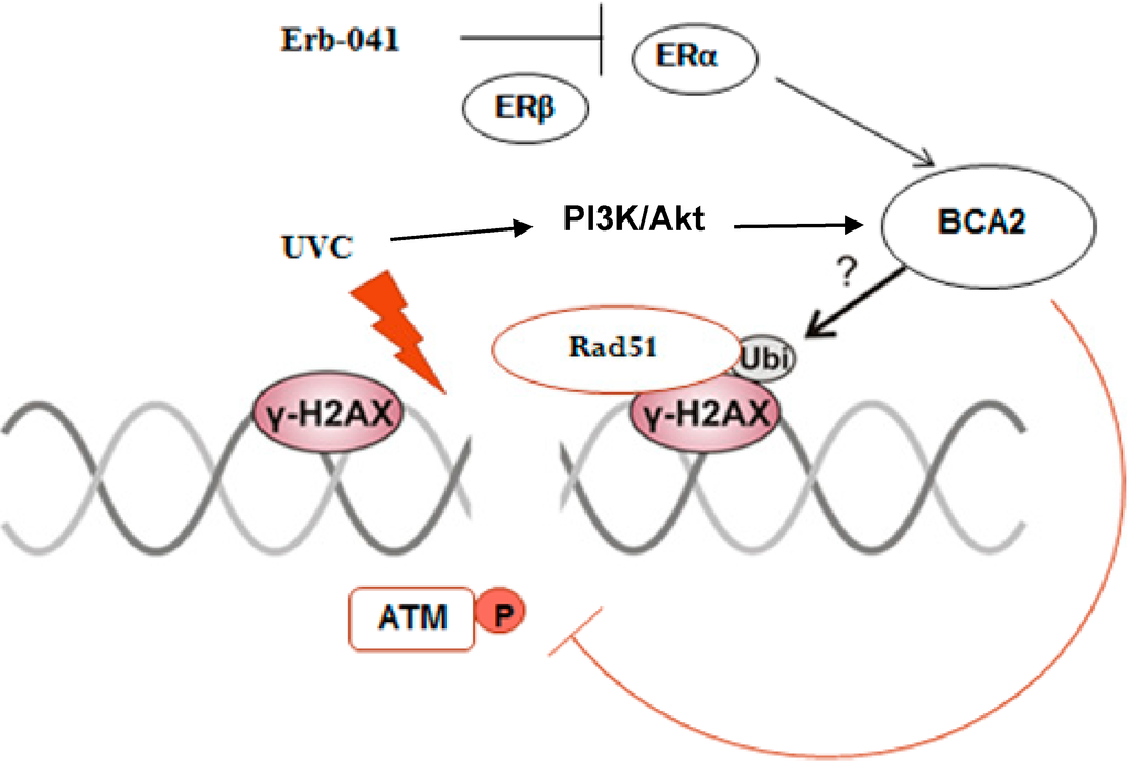 Proposed working model. In response to UVC, MCF-7 cells increase the ubiquitination activity and chromatin-binding ability of BCA2 through AKT-mediated BCA2 activation [28,38]. The association of BCA2 with γH2AX incites a BCA2/H2AX/ATM axis, initiating the DDR and controlling breast cancer cell sensitivity. The importance of Erb-041 in suppressing DNA recombination repair through BCA2 inhibition is based on the mitigatory effect of Erb-041 on AKT activation and ERα-mediated BCA2 transcription [4]. By pretreating MCF-7 cells with Erb-041, UV-induced chromatin-bound Rad51 and BCA2 became solubilized, leading to the abolition of DNA repair.