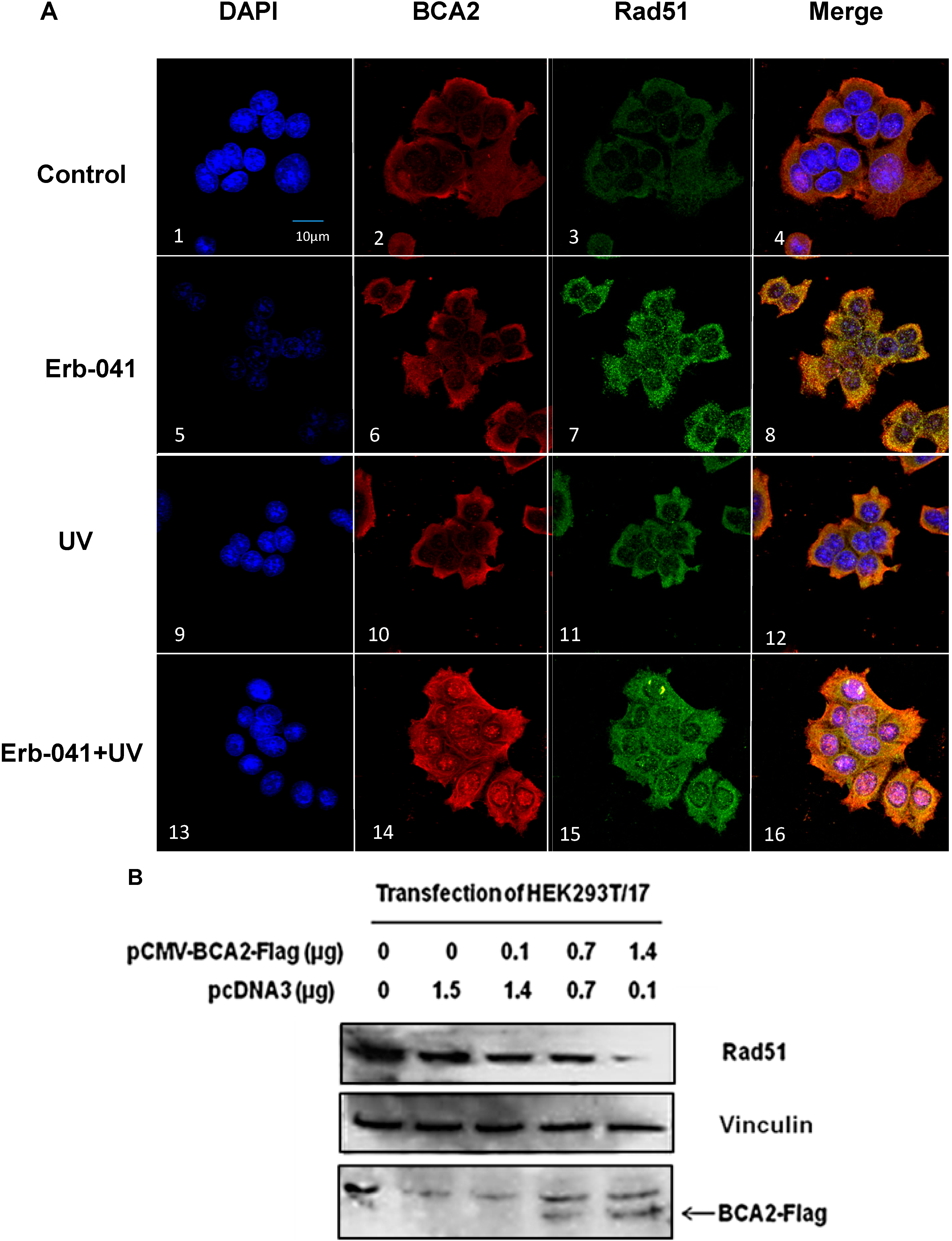 3.6. Rad51 Protein Degradation May Be Preceded by the Nuclear Co-Localization of BCA2 and Rad51 Under Co-Treatment with Erb-041 and UVC