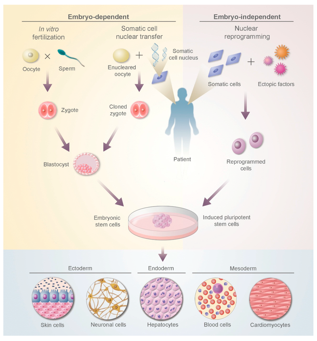 iPSCs have similar properties to ESCs, including pluripotency and self-renewal, but sidestep the major concerns inherent to the use of this type of cells. iPSCs are produced in vitro from somatic cells, bypassing the use of embryonic tissue or oocytes and thereby avoiding ethical controversy [30]. Furthermore, they offer the possibility for autologous use, solving the problem of allogeneic rejection. The use of iPSCs, which were first described in 2006 [31], has rapidly grown as a promising alternative to embryonic stem cells, but before their clinical application may be considered several questions must be addressed, and their equivalence to ESCs must be ascertained [32]. Figure 1 shows the differences in production between iPSCs and ESCs.