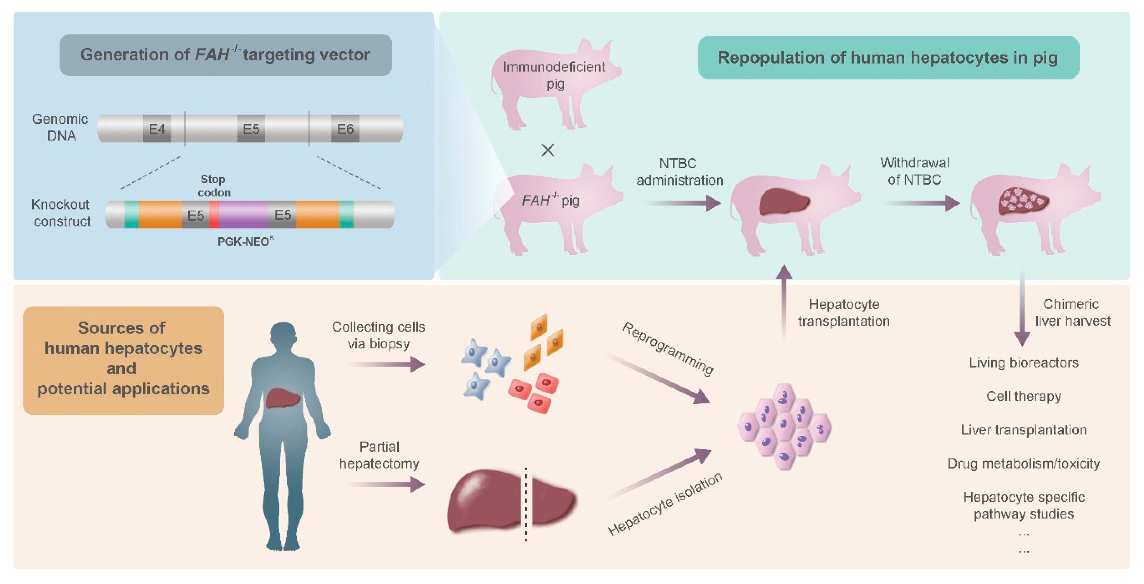 Repopulation of FAH-deficient pig livers with human hepatocytes. Nitisinone (NTBC) is used to treat FAH-deficient animals while hepatocyte engraftment and proliferation takes place.