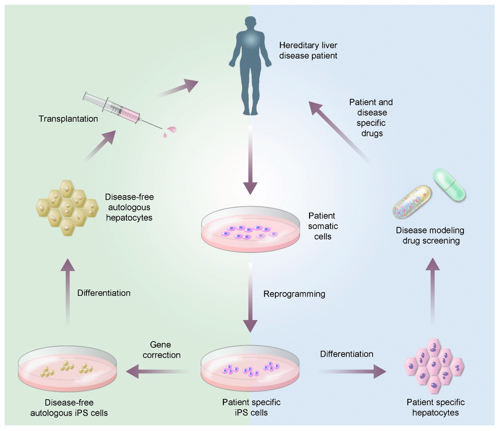 With the development of stem cell technology, and particularly the development of iPSCs, hereditary liver disease treatment can be taken a step further: by combining genetic correction technology with autologous cell transplantation, patient-specific therapies can be created [77,78]. Disease-free autologous hiPSCs are first generated through ex vivo gene therapy [79], and the genetically-corrected hiPSCs then differentiated and used for transplantation. Figure 3 shows how hiPSCs can be combined with gene correction and differentiation techniques to produce autologous, disease-free hepatocytes for transplantation.