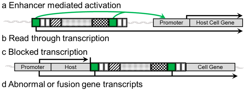The integration of retroviral vectors alters the chromosome such that retroviral vectors are de facto mutagens. The majority of vector integrations are benign, but an integration near or within a gene can lead to dysregulation of that gene. Depending on the gene, dysregulation can lead to tumorigenesis, specifically leukemia in HSC gene therapy [12,13,14,15,16,17]. The most commonly observed form of dysregulation by vector proviruses in clinical trials is enhancer-mediated activation of proto-oncogenes. For upregulation to occur, an integration event occurs near the proto-oncogene transcription start site, and an enhancer within the retroviral vector then activates the promoter (Figure 1a). Some retroviral vectors have inefficient transcription termination within the LTR such that transcription can continue through the 3′ LTR and into the chromosome (Figure 1b) [18]. This is known as read-through transcription. Integration within gene-coding regions can also lead to dysregulation by blocked transcription or abnormal fusion transcripts (Figure 1c,d).