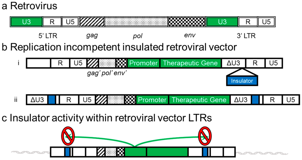 Though the specific mechanism of action is not fully understood, all known enhancer-blocking insulators function when positioned between an enhancer and a promoter. This defining characteristic must be taken into consideration for retroviral vector design in order to exploit these elements to increase safety. This presents the challenge of incorporating two copies of an insulator flanking the enhancer elements within the vector. The viral enhancer elements have been removed from the LTRs of current retroviral vectors. This leaves the internal enhancer-promoter of a therapeutic gene cassette as a potential source for enhancer-mediated activation of host genes [1,2,3]. Therefore, a successful insulated vector requires two insulators that flank the transgene cassette. The most popular insulated vector design features the insulator in the 3′ LTR U3. This utilizes the replication process of retroviral vectors wherein the U3 of the 3′ LTR is copied to the 5′ LTR and the U5 of the 5′ LTR is copied to the 3′ LTR during reverse transcription. This replication process results in an integrated vector provirus flanked with two identical insulators. This approach is potentially less susceptible to a recombination event during reverse transcription that would result in the loss of the therapeutic transgene cassette, which could occur if the transgene cassette was directly flanked by insulators [30,58]. Additionally, during vector development, enhancer sequences have been removed from the U3 of the vector LTRs without much effect on titer. This suggests a location where a new DNA element could be tolerated, essentially replacing one regulatory element with another (Figure 3).