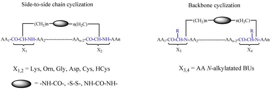 Rational design of peptides is usually validated by two optimization methodologies: cyclo scanning (CYCLOSCAN) and positional scanning. These methods are also useful in phage display and OBOC for optimizing peptide hits. Notably, classical modes of cyclization include the formation of a lactam bridge through carboxyl and amino functional groups, or disulfide bridges through thiol groups leading to side-chain-to-side-chain bridge formation (Figure 2). Two main drawbacks to this classical mode were reported: (i) cyclization may lead to a loss of biological activity, due to the involvement of side chain groups crucial for bioactivity; and (ii) the number of cyclization possibilities is limited. If the linear peptide does not contain the appropriate amino acid to allow classical cyclization, various amino acids in the native sequence need be replaced by amino acids bearing amine (Lys, Orn), carboxyl (Glu, Asp) or thiol (cysteine), an operation that may lead to loss of biological activity [50,51].
