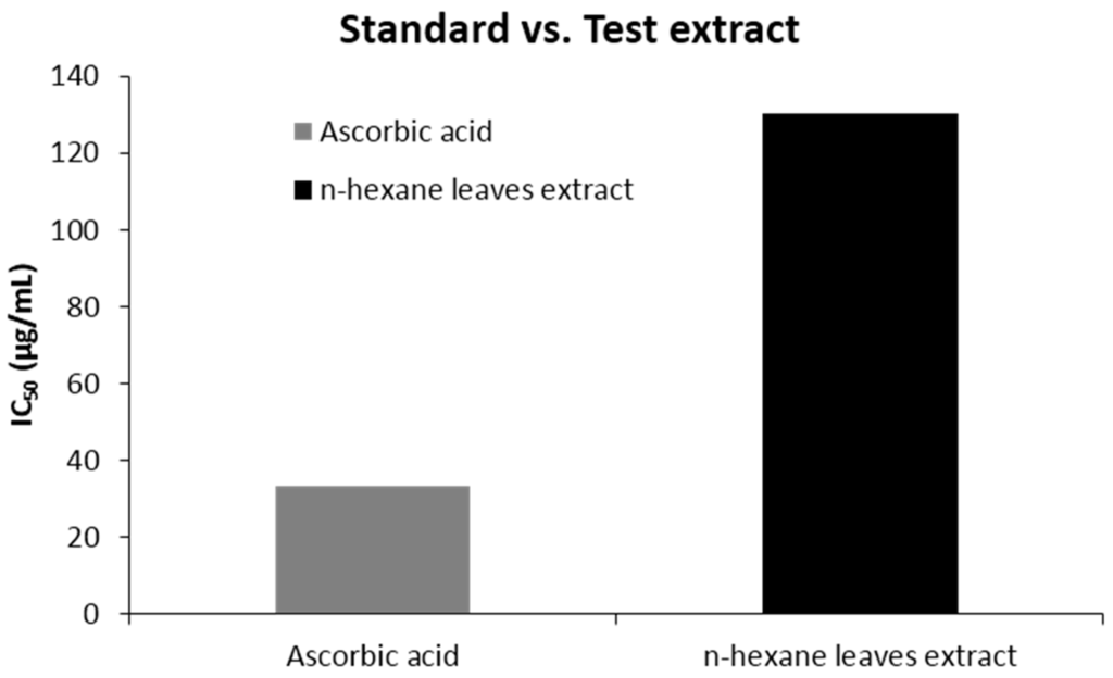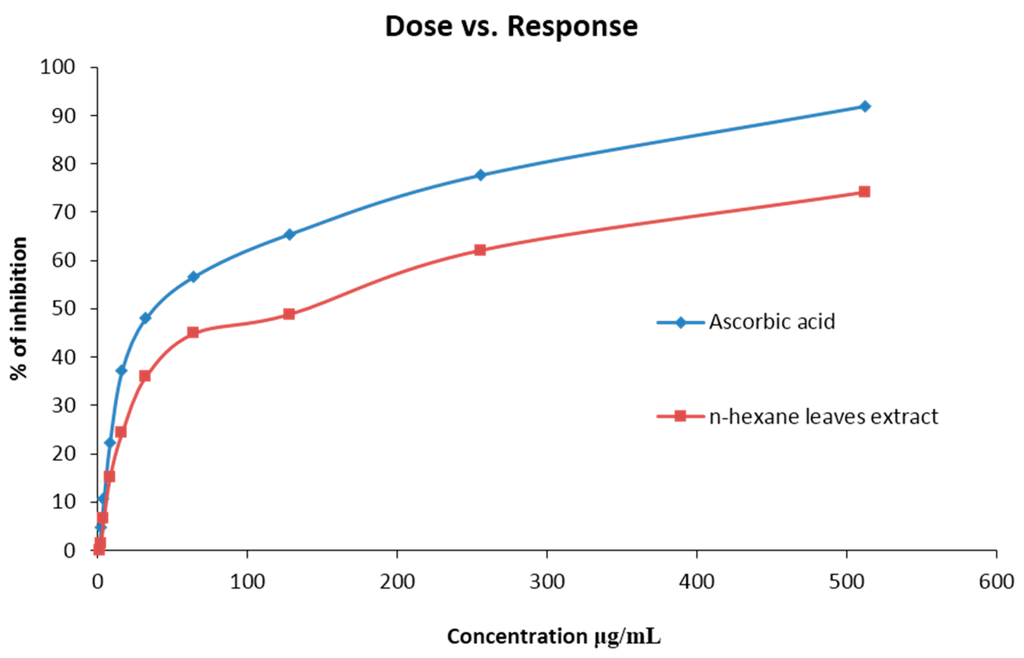 DPPH scavenging assay were performed on the previously diluted extracts of n-hexane fraction of C. urens leaves and the standard was controlled using the same dilutions of ascorbic acid [21].