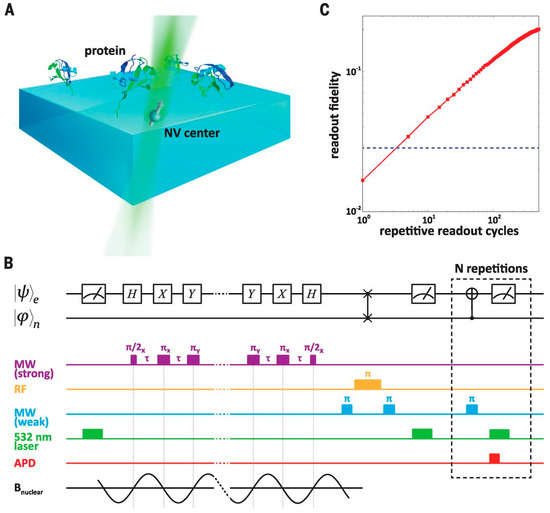Experimental setup and magnetometry with repetitive readout described in [11]. Image from [11]. Reprinted with permission from AAAS. (A) Schematic of the experimental setup. Ubiquitin proteins attached to the diamond surface are probed using a proximal quantum sensor consisting of a nitrogen-vacancy (NV) center electronic spin and its associated 15 N nuclear spin; (B) Quantum circuit diagram and experimental magnetometry pulse sequence; (C) Measured gain in the readout fidelity as a function of repetitive readout cycles. MW: microwave; RF: radiofrequency; APD: avalanche photodiode; B magnetic field of the nuclear spin.
