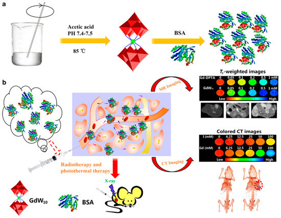 Schematic illustration of gadolinium polytungstates nanoclusters GdW10@BSA NCs for dual-modal magnetic resonance (MR) / computed tomography (CT) imaging-guided photothermal therapy/radiotherapy of cancer. (a) The synthesis process of GdW10@BSA; (b) The application of the as-made GdW10@BSA for bio-imaging and treatment of tumor. Image from [29]. Article distributed under a Creative Commons CC-BY license.