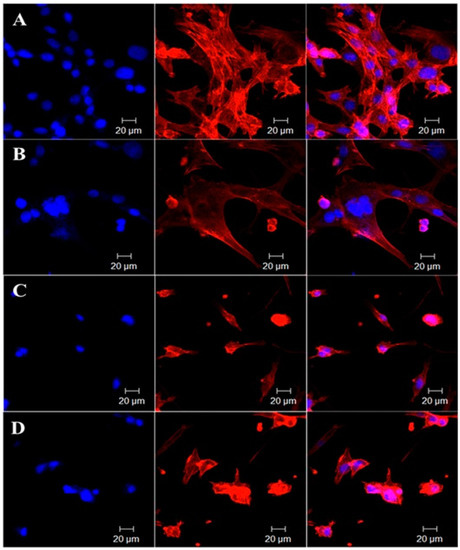 In vitro cytoskeletal imaging with rhodamine B displaying localized tumoricidal effects of (A) GO-IO (control); (B) GO-IO-MH; (C) GO-IO-DOX; and (D) GO-IO-DOX-MH. Image from [32]. Article distributed under a Creative Commons CC-BY license.
