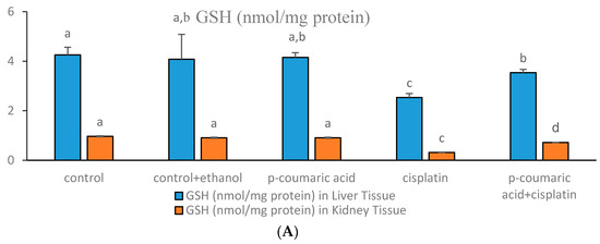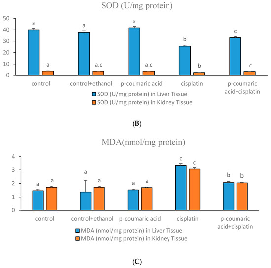 (A) Glutathione (GSH) levels in rat liver and kidney tissues. The effects of p-coumaric acid (PCA) administration on GSH levels against Cisplatin (CIS)-induced damage in the liver and kidney of rats (mean ± SEM). a p < 0.05 as compared with CIS and PCA + CIS groups. c p < 0.05 as compared with PCA + CIS group and others. b p < 0.05 as compared with the control and CIS groups. b p < 0.05 as compared with cisplatin group and others; (B) Superoxide dismutase (SOD) levels in rat liver and kidney tissues. The effects of PCA administration on SOD activity on cisplatin-induced damage in the liver and kidney of rats (mean ± SEM). a p < 0.05 as compared with cisplatin and PCA + CIS groups. c p < 0.05 as compared with the control and CIS groups. b p < 0.05 as compared with the control, control + ethanol, PCA and PCA + CIS groups; (C) Malondialdehyde (MDA) levels in rat liver and kidney tissues. The effects of PCA administration on MDA levels in CIS-induced damage in the liver and kidney of rats (mean ± SEM). a p < 0.05 as compared with CIS and PCA + CIS groups, c p < 0.05 as compared with all other groups, b p < 0.05 as compared with the control, control + ethanol, PCA and PCA + CIS groups.