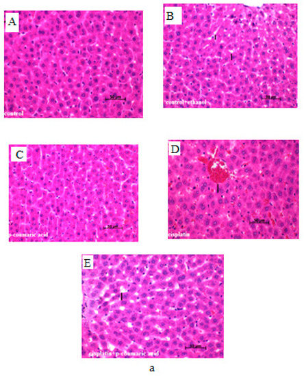 p-Coumaric acid (PCA) and ethanol were obtained from Sigma-Aldrich Chemical Co. CIS was supplied by Koçak Farma Co. (Koçak İstanbul, Turkey, 50 mg/100 mL, intravenous (i.v.)). The rats were randomly separated into five groups including control, control + ethanol, CIS, PCA, and PCA + CIS. Drugs were not applied to the control group. Ethanol (20%, 1 mL, intraperitoneal (i.p.)) was given to the control + ethanol group. PCA was dissolved in 20% ethanol. Later, PCA (100 mg/kg, body weight (b.w.) on three consecutive days before sacrificing; i.p.) was administered to the PCA group. The CIS group was exposed to a single dose of CIS (10 mg/kg b.w., single dose; i.p.) by intraperitoneal injection. PCA and CIS were applied in the PCA + CIS group. All animals were sacrificed under anaesthesia 24 h after CIS administration [34,35,36]. High dose anaesthesia was achieved using thiopental sodium (400 mg/kg b.w.; i.p.). At the end of the experiment, liver and kidney samples were taken and either fixed in 10% formaldehyde for histopathological examinations or stored at −80 °C for subsequent measurement of malondialdehyde (MDA) and glutathione (GSH) levels and superoxide dismutase (SOD) activity.