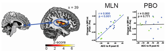 A number of studies have shown that pharmacological interventions can modulate brain response to painful stimuli, such as an increase in pressure pain induced neural activation in the posterior cingulate cortex following MLN intake [48]. As previously indicated, current research suggests that aberrant functional connectivity between pain-processing brain regions may underlie the pathogenesis of FM and other chronic pain states, and is potentially a better biomarker of clinical pain. As such, rs-fc can also be viewed as a promising parameter to monitor changes in brain function associated with pharmacological treatment and/or predict treatment response. In a recently-published study, our group was able to show that decreased functional connectivity between pro-nociceptive regions and anti-nociceptive pain regions at baseline (before treatment), specifically between the rostral part of the anterior cingulate cortex and the IC, as well as between the periaqueductal gray and the IC were associated with reductions in clinical pain scores during MLN therapy; i.e., patients with lower preexisting functional connectivity had the greatest reduction in clinical pain [49]. Figure 1 illustrates the association between rs-fc and pain response to MLN. Furthermore, Harris et al. [50] demonstrated that the treatment of FM patients with pregabalin leads to a reduction in insular glutamate/glutamine concentrations associated with a dissociations in rs-fc between the IC and the inferior parietal lobule (a key structure within the default mode network), which was in turn correlated with reduction in clinical pain [50].