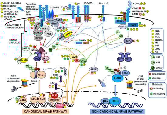 The two pathways are interconnected, as the canonical one regulates p100 and RelB levels [8]. Both canonical and non-canonical NF-κB activation pathways have been implicated in human hematological malignancies, mainly lymphoid leukemia and lymphoma. Because NF-κB regulates a large array of target genes, the constitutive activation of NF-κB can support most steps involved in cancer transformation: inhibition of cell differentiation and apoptosis, promotion of cell proliferation, angiogenesis, cancer-related inflammation and metastatic potential, and resistance to treatments. The constitutive activation may have different origins. It can result from rearrangements and mutations in genes encoding NF-κB or IκB members, or in genes encoding upstream components of the cascade, but it may also derive from persistent autocrine or paracrine signaling and/or hyper-activation of immune receptors (TcR, BcR, TLRs). In this review article, we present the role of the NF-κB pathway and subunits in human hematologic malignancies. Figure 1 summarizes the molecular partners involved in the two pathways to NF-κB activation, as well as the dysregulations that occur in hematologic malignancies. For a broader description of the role of NF-κB subunits in cancer, see [9].