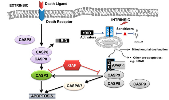 The intrinsic apoptotic pathway is also regulated by the balance of pro-apoptotic and anti-apoptotic members of the BCL-2 family, by other mitochondria derived molecules, and by other caspase inhibitors. BCL-2 inhibitor of apoptosis inhibits the apoptotic process in several steps, by controlling calcium flux [29] and binding and inhibiting pro-apoptotic proteins (e.g., BAX/BAK) [30,31]. Other studies also suggest a role in the regulation of the activity of beclin-1 to initiate autophagy [32], and in the regulation of cytoplasmic levels of acetyl coenzyme A (acetyl-CoA) as a substrate for protein α-acetylation as a signaling molecule associated with apoptotic sensitivity [33]. X-linked inhibitor of apoptosis protein (XIAP), a member of the inhibitor of apoptosis family of proteins (IAPs), binds to and inhibits caspase-3, -7 and -9 [34]. Interestingly, molecules released by the mitochondria, such as SMAC, are able to inhibit IAP mediated inhibition of caspases. Additionally, certain BH3-only proteins termed “activators”, notably BID and BCL-2-interacting mediator of cell death (BIM or BCL2L11), can bind transiently to BAX and induce its activation, whereas the others, termed ‘‘sensitizers’’ (e.g., BCL-2-associated death promoter (BAD)), act instead by freeing the activators or BAX from pro-survival relatives (e.g., anti-apoptotic molecules such as BCL-2).