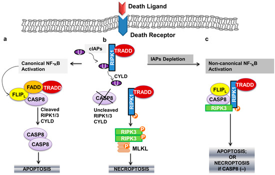 Recruitment of TRADD by stimulation of TNFR1, as described in the previous paragraphs, also attracts receptor-interacting protein kinase 1 (RIPK1), forming TRADD-dependent receptor complex I. RIPK1 is then subject to Lys63 polyubiquitylation by IAP1 or cIAP2, activating NF-κB, with resulting upregulation of anti-apoptotic genes such as FLIPL [81,82]. A more detailed description of additional adaptor molecules involved can be found in a nice recently published article [80]. In cells undergoing apoptosis, cylindromatosis (CYLD) would remove Lys63-linked polyubiquitins from RIPK1 [83], rendering complex I unstable and allowing RIPK1 to dissociate from the plasma membrane and interact with TRADD-dependent complex IIa; in this complex FLIPL and pro-caspase 8 form a heterodimeric caspase that cleaves and inactivates RIPK1 (and RIPK3), as well as CYLD, to prevent necroptosis [84] (Figure 2a). However, when caspase-8 is inhibited, the RIP homotypic interaction motif (RHIM) domains of RIPK1 and RIPK3 associate in microfilament-like complexes called necrosomes, an amyloid-like structure that acts as the transducer of the necroptotic signal [85]. RIPK3 is thus able to phosphorylate a protein called mixed lineage kinase domain-like protein (MLKL), which then translocates to the plasma membrane, causing damage to execute necrosis [86]. (Figure 2b). This results in a late wave of JUN N-terminal kinase (JNK) activation, ROS production and the induction of necroptosis [86]. Additionally, oligomerized MLKL translocates to the plasma membrane mediating TNF-induced necroptosis in a calcium influx-dependent way [87]. Importantly, IAP degradation (for example, in the presence of SMAC), will result in non-canonical NF-κB activation, with formation of a TRADD independent complex between RIPK1/3, FADD and FLIPL (ripoptosome or complex IIb). RIPK1-dependent complex IIb can induce both necroptosis and apoptosis, which is dependent on the absence or presence of caspase-8 activity, respectively (Figure 2c).