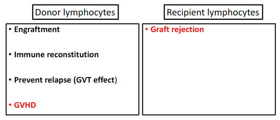 Immune balance between donor and recipient lymphocytes showing favorable (black) and unfavorable (red) effects played by each side. GVT = graft versus tumor.