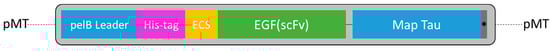 Schematic representation of the expression cassette for the recombinant epidermal growth factor (EGF)–MAP human cytolytic fusion protein. The open reading frame (ORF) was expressed in E. coli BL21(DE3) using protocol for periplasmic stress expression in the presence of compatible solutes and includes an N-terminal pectate lyase B (pelB) leader sequence from Erwinia carotovora which directs the fusion protein to the periplasmic space, a His10 tag to facilitate purification, and an enterokinase cleavage site (ECS) to allow proteolytic separation of the fusion construct from the upstream production sequence. * = C-terminal nuclear localization signal sequence (NLS).