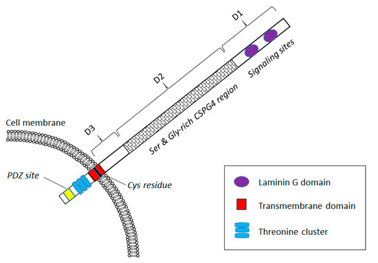 The extracellular region of CSPG4 consists of three domains (D1–3), with D1 most distal from the membrane and D3 most proximal to the cell membrane. Each of these domains has distinct structural and functional properties, including binding domains for growth factors and other ligands that constitutively activate mitogenic pathways and transcription [3,4]. The N-terminal domain D1 is characterized by various signaling regions, including a laminin globular (G) domain. D2, the largest extracellular domain, is rich in serine and glycine and includes collagen V and VI binding sites. Characteristically, this domain also comprises several sites for N- and O-linked glycosylation and chondroitin sulfate glycosaminoglycan (CSGAG) modification. CS addition takes place in the Golgi apparatus and the degree of glycosylation can increase the size of the protein to over 500 kD [5]. This modification is seemingly not required for signal transduction functionalities of the CSPG4, although it does mediate differential ligand binding [6]. D3, a small globular region, is the most C-terminal of the extracellular part of CSPG4 and is exclusively subject to N-linked glycosylation.