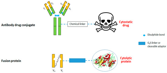 Protein-based ITs consist of a disease-specific antibody fragment (targeting domain) recombinantly fused to a cytotoxic protein, such as Exotoxin A (effector domain) separated by intramolecular peptide linker [38]. In general, ITs exhibit acceptable tumor penetration and serum stability. Improved tumor penetration is achieved by using a tumor-targeting scFv (or nanobody) [36] and the smallest truncated form of a protein toxin that still retains its cytotoxicity. This approach yields a much smaller drug molecule than the first-generation full-length mAb and full-length toxin versions. Protein engineering technology has also been used to design ranges of peptide linker variants, including linkers with elements that facilitate production and purification, as well as those that improve serum stability and influence intracellular routing of the IT [39,40,41].