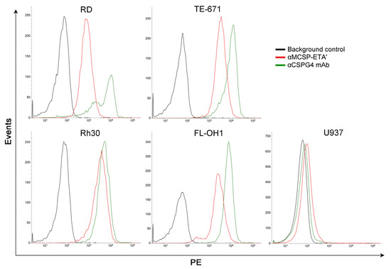 Binding analysis of αCSPG4-ETA′ (αMCSP-ETA′) immunotoxin to rhabdomyosarcoma (RMS) cell lines (RD, TE-671, Rh30 and FL-OH1) versus CSPG4− U937 lymphoma cells. All cells lines were incubated with αCSPG4 mAb or αMCSP-ETA′ and analyzed by flow cytometry. Reprinted from Brehm et al. (2014) with permission from Elsevier [24].