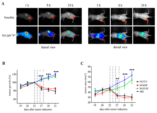 Treatment with αMCSP-MAP tau in mouse xenograft tumor model. (A) Distribution of αMCSP-MAP tau over time post-injection—distribution of DyLight 747-labeled hCFP (blue) in relation to Katushka-labeled (red) tumor tissue was monitored by whole body imaging. Red arrows indicate tumor site; (B) Relative tumor size of xenograft mice treated with αMCSP-MAP tau, αMCSP-ETA′, αMCSP-SNAP and phosphate buffered saline (PBS). Tumor size was measured using caliper and normalized to pre-treatment tumor size; (C) Tumor volume calculated from caliper measurements. p-Values of *** p ≤ 0.001 and ** p ≤ 0.005 were based on two-way ANOVA statistical analysis. Reprinted with permission [54]. Copyright 2016 International Journal of Cancer.