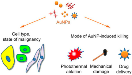 Among substantial nano-materials being studied for nanomedicine applications, gold nanoparticles (GNPs) are being explored as a paradigm because of (a) their shape, size and surface chemistry, which can be easily controlled and modified; (b) their biocompatibility and lower cytotoxicity [15]; and (c) their capacity to be used as tumor specific drug carrier agents, imaging agents, radiosensitizers, and antiangiogenic agents [16]. The therapeutic value of GNPs are based on their various properties; enhanced permeability and retention (EPR) being one which facilitates their infiltration inside tumors [17]. Multiple in vitro studies show that GNPs confer their cytotoxicity in cells by induction of oxidative stress, mechanical damage, photothermal ablation and drug delivery [16,17,18]. Gold nanoparticles, due to their surface Plasmon resonance effect, can absorb strongly in visible and near infrared regions, and are very well suited for applications in cancer phototherapy [19,20]. As depicted in Figure 1, GNPs can destroy cancer cells by photothermal ablation, mechanical damage or by drugs used in cancer treatment.