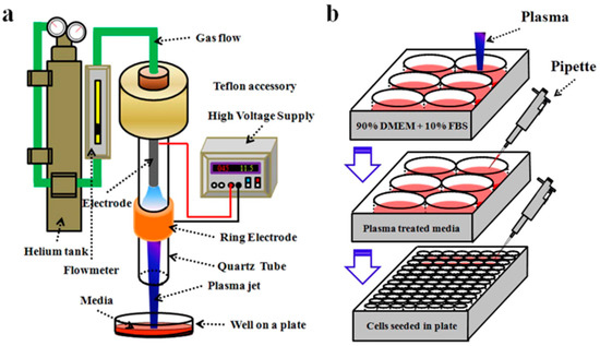 Schematic diagram showing the two methods of plasma treatment. (a) Direct treatment on cells with media and also depicts the general plasma generation process. Helium gas acts as a carrier gas for continuous generation of plasma (green line). Plasma (blue line) is generated in between the two electrodes by the application of high voltage. The generated plasma jet can directly be exposed to the cell culture vessels; (b) Exposure of cells into plasma treated media. (Dulbecco’s Modified Eagles Medium (DMEM) is cell culture medium used in conjugation with Fetal Bovine Serum (FBS)).