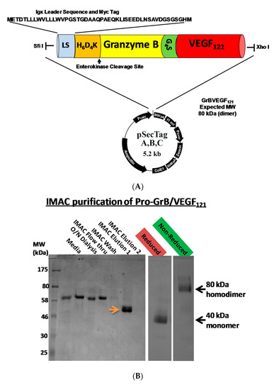 Mammalian expression of the Granzyme B/VEGF121 construct was initiated by fusing the GrB/VEGF121 DNA cassette into the pSecTag vector (Figure 1A). We have expressed GrB/VEGF121 using HEK-293T, HEK-293E, and CHO-S cells, and harvested the secreted fusion protein under serum-free conditions (Figure 1B). The construct is expressed as an inactive pro-GrB/VEGF121 form. Removal of the N-terminus histidine tag results in an 80 kDa dimer. The expressed protein is enzymatically active, as determined by a chromogenic assay measuring the rate of substrate turnover (Figure 1C).