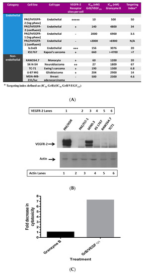 - Mohamedali, K.A.; Cao, Y.; Cheung, L.H.; Hittelman, W.N.; Rosenblum, M.G. The functionalized human serine protease granzyme B/VEGF121 targets tumor vasculature and ablates tumor growth. Mol. Cancer Ther. 2013, 12, 2055–2066. [Google Scholar] [CrossRef] [PubMed]