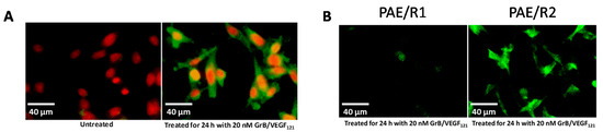 To ensure that toxicity of GrB/VEGF121 is both targeted and specific, we evaluated a panel of endothelial and tumor cells lines with varying levels of VEGFR-1 and VEGFR-2 on their cell surface. Porcine cell lines over-expressing human VEGFR-1 or VEGFR-2 are considered to model tumor neovasculature, and have been used as in vitro models of angiogenesis [66]. Other cell lines were selected based on our previously established cytotoxic profiles with VEGF121/rGel, as well as cell surface VEGFR-1 and VEGFR-2 levels, as established by flow cytometry. In vitro cytotoxicity studies over 72 h showed varying levels of sensitivity to GrB/VEGF121 that correlated closely to total VEGFR-2 expression. IC50 levels were found to be in the nanomolar range (Figure 2A,B). The cytotoxicity was determined to be VEGFR-driven, as pre-incubation of VEGFR-2+ cells with 1 µM VEGF121 significantly reduced the cytotoxicity of GrB/VEGF121, but had no impact on the cytotoxicity of GrB alone (Figure 2C). In VEGFR-2 positive endothelial cells, GrB/VEGF121 showed rapid internalization into the entire cytoplasmic space within 24 h, while the internalization into VEGFR-1-expressing cells was significantly reduced (Figure 3), further confirming the VEGFR-driven targeting.