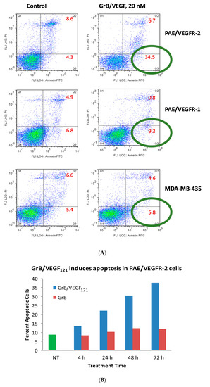 GrB/VEGF121 triggers apoptosis in target cells. (A) Annexin V/PI staining at 24 h after onset of incubation with GrB/VEGF121. Circles indicate the percent of cells in early apoptosis. (B) Induction of apoptosis over 72 h in VEGFR-2-overexpressing endothelial cells by the targeted GrB/VEGF121 compared to the non-targeted GrB. Green: untreated control; red: GrB treatment; blue: GrB/VEGF121 treatment.