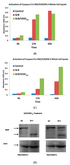 GrB/VEGF121 triggers mitochondrial depolarization and caspase activation in target cells, resulting in PARP-1 cleavage. (A) GrB/VEGF121 selectively triggered mitochondrial depolarization over 48 h selectively in VEGFR-2-overexpressing endothelial cells. (B) Using a Caspase-3 chromogenic substrate, Caspase-3 activation was also observed, as was (C) activation of Caspase-9 with the appropriate chromogenic substrate. (D) PARP cleavage was more robust and complete in VEGFR-2-overexpressing endothelial cells, compared to VEGFR-1-overexpressing endothelial cells.