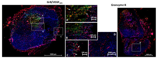 GrB/VEGF121 localizes into the tumor and tumor perivascular space. Sections were stained with immunofluorescence reagents to detect murine blood vessels (CD31, red), nuclei (Hoechst, blue) and Granzyme B (green). Co-localization of GrB into CD31+ tumor vessels appears yellow (representative areas indicated with white arrows). (A–C) Localization of GrB/VEGF121 into the PC-3 (prostate) tumor and the tumor perivascular space, as determined by immunofluorescence detection. (D) Free Granzyme B was not detected in the tumor using the same detection methods.