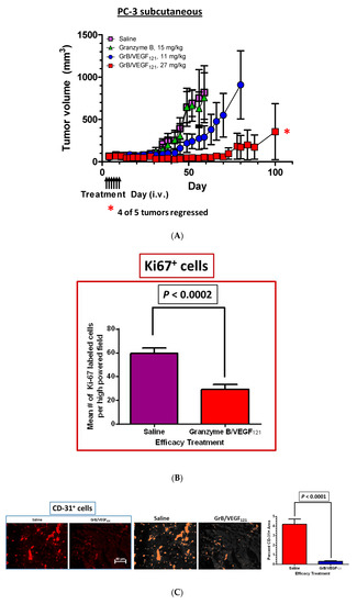 The efficacy of GrB/VEGF121 was also evaluated in a PC-3 subcutaneous tumor model. Mice received intravenous injections of saline, Granzyme B or GrB/VEGF121 every other day for a total of six treatments, and tumor volume was monitored twice weekly. Mice treated with GrB/VEGF121 at 27 mg/mg had very limited tumor growth, whereas those treated with a lower dose of GrB/VEGF121 (11 mg/kg) showed tumor growth of about threefold over 30 days. In contrast, tumors of saline- or Granzyme B-treated mice grew over 15-fold over the same period of time (Figure 7A). The reduced growth rate of GrB/VEGF121-treated mice compared to vehicle was confirmed by determining the number of cycling tumor cells in lesions, and found to be reduced by over 50% (Figure 7B). The impact of tumor vasculature was assessed by histopathologic analysis of the vascular area, and found to be significantly lower in GrB-VEGF121-treated mice compared to controls (Figure 7C).