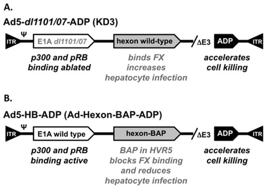 Wild-type adenovirus serotype 5 (Ad5) was purchased from ATCC. Ad5-ADP has the E3 region deleted before the adenovirus death protein (ADP) []. This upstream E3 deletion amplifies ADP expression and accelerates cell killing. Ad5-E1A-dl1101/07 was originally generated and described as KD3 [] (Figure 1A). KD3 was generously provided by Dr. William Wold from Saint Louis University. This virus has two deletions in E1A that are derived from the Ad mutant dl1101/07 that ablate the ability of E1A to bind to pRB and p300 rendering the virus relatively cancer-specific []. The upstream E3 region of Ad5-E1A-dl1101/07-∆E3-ADP is also deleted leaving ADP present. Ad5-hexon-BAP also has the E3 deletion and over-expressed ADP, but has a wild-type E1A protein. For hepatocyte detargeting, this virus displays a 7.4 kDa biotin acceptor peptide (BAP) that was inserted into the HVR5 of hexon [,,]. This BAP blocks FX binding and markedly reduces hepatocyte infection []. Adenoviruses were produced from 293 cells in a 10 plate CellStack (Corning Life Sciences, Lowell, MA, USA). Viruses were purified by sequential banding on two CsCl gradients and viral particle numbers were quantitated by OD260.