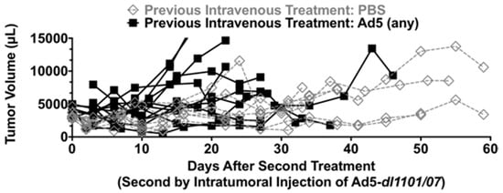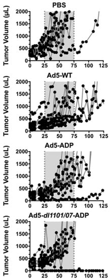 To do this, naive animals (previously with PBS) and Ad5-immune animals (previously treated with any Ad5) were injected intratumorally with Ad5-dl1101/07-ADP and tumor sizes were monitored (Figure 5). In this case, there was no obvious additional therapeutic effect of Ad5 administration into the tumors in naive or Ad5-treated animals. For most animals, tumor sizes remained relatively static, with only a few animals’ tumors growing and requiring sacrifice due to this effect. A total of 3/8 (37.5%) of PBS pre-treated animals and 5/12 (41.7%) of Ad5 animals had relatively static tumor sizes and survived after intratumoral Ad5-dl1101/07-ADP treatment.