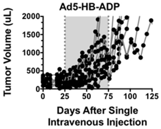 The groups were followed beyond 125 days and Kaplan–Meier survival analysis was performed using tumor size in excess of 2000 µL as an event (Figure 3B). Most animals in the PBS and the Ad5-dl1101/07-ADP groups exceeded 2000 µL tumor volumes within 80 days of treatment. Survival was extended for the other groups, however, only Ad5-ADP and Ad5-HB-ADP survival was significantly better than the PBS group (p < 0.01, and <0.05, respectively by log-rank analysis).