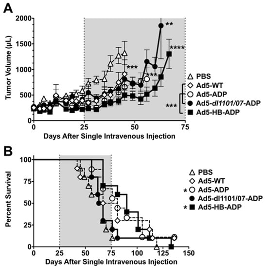 Tumor growth was significantly delayed by Ad5-WT (p = 0.007), Ad5-ADP (p = 0.0005), and Ad5-HB-ADP groups (p = 0.0001) when compared to the PBS group in the (Figure 3A). Most Ad5-dl1101/07-ADP treated animals required sacrifice within 75 days, but this was still significantly different to the PBS group (p = 0.001).
