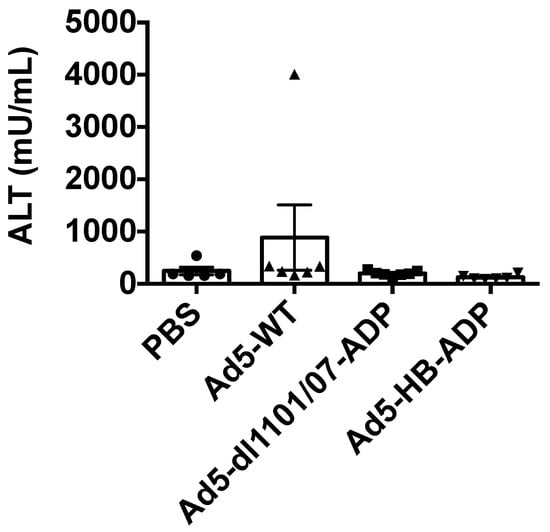 We previously showed in mice that Ad5-HB reduced liver damage after intravenous injections in mice by reducing hepatocyte infection []. Ad5 with dl1101/07 mutations also reduces liver damage after intravenous injection in mice and hamsters []. To test this head-to-head in hamsters, animals were injected with the same vectors at the 1.5 × 1011 vp dose used in the efficacy study and their blood was tested three days later for release of liver alanine aminotransferase (ALT) release. At these doses, no changes in ALT were observed (data not shown). Hamsters were injected with 7.5 × 1011 vp, the highest feasible dose given injection virus concentration and volume parameters. Under these conditions, no significant increases were observed at day three when compared to PBS-treated animals (Figure 4).