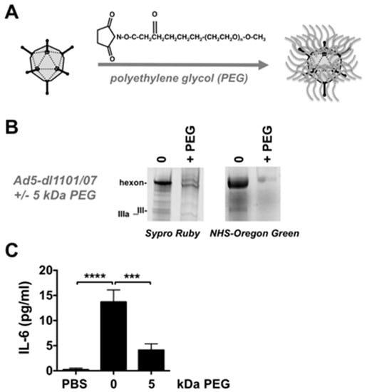 Polyethylene Glycol (PEG) Modification of Ad5-dl1101/07-ADP. (A) Scheme of chemical shielding with PEG; (B) SDS-PAGE analysis of PEGylated Ad5-dl1101/07. Viruses were separated on SDS-PAGE gels after desalting for Sypro Ruby staining or were reacted with succinimide-activated NHS-Oregon Green fluorophore by green fluorescence to detect remaining unreacted amines; (C) Animals received 3 × 1010 vp of virus and were bled 6 h later and sera were tested by IL-6 ELISA. *** = p < 0.01. **** = p < 0.0001 by analysis of variance (ANOVA).
