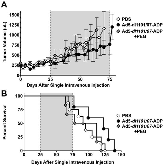 To test the Ad5-dl1101/07-ADP CRAd with and without PEGylation, the viruses were injected a single time by the intravenous jugular route with PBS or with 1.5 × 1011 vp dose (Figure 7). Under these conditions, hamsters treated with a single low intravenous dose of Ad5-dl1101/07 grew slightly slower than PBS controls (Figure 7A). Tumor growth in the 5 kDa PEGylated Ad5-dl1101/07 group was virtually identical to the PBS group. Kaplan–Meier survival analysis recapitulated tumor growth in the groups with the PBS and 5 kDa PEG group being similar (Figure 7B). Unmodified Ad5-dl1101/07 mediated better survival than the other groups (p = 0.08) although this did not quite meet the p < 0.05 threshold of significance. However, the median survival of 97 days for the PBS group was extended to 123 days by only one intravenous injection of Ad5-dl1101/07 treatment. Median survival for the 5 kDa PEG group was 95 days.