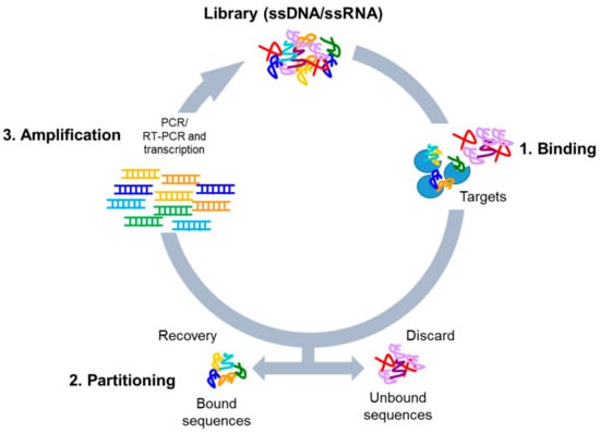 Scheme of the SELEX process. The procedure involves repeated cycles of: 1. Incubation of the high complexity library with the targets (binding); 2. Removal of unbound sequences and recovery of the bound oligonucleotides (partitioning); 3. Amplification of the bound sequences by PCR (for DNA library) or RT-PCR and transcription (for RNA library).