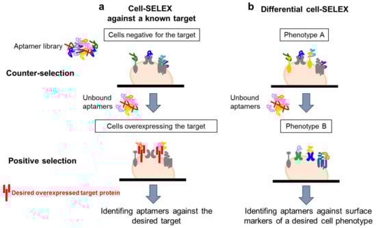 The use of complex target for aptamer selection was introduced for the first time by Morris et al. [9] in 1998. They used human red blood cell membrane preparations (RBC ghosts) instead of purified membrane proteins to isolate multiple ssDNA molecules with high affinity for different cell membrane targets. This work opened the path to the development of whole, living cell SELEX protocols. Generally, these protocols have been adopted to isolate aptamers able to recognize a known target of interest or a specific cell phenotype (Figure 2a,b). In both cases, a fundamental aspect is the inclusion of a counter-selection step to avoid the parallel enrichment of aptamers for unwanted targets. The negative selection step is introduced before the positive selection at each round, allowing filtering out sequences against those molecules commonly expressed on both the target and control cell lines.