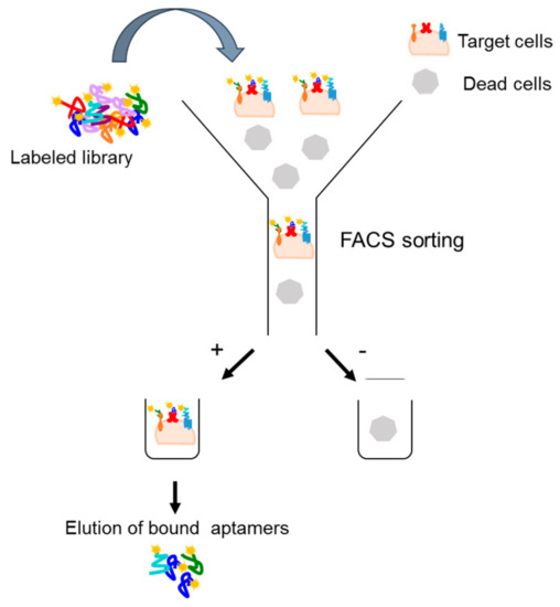 Scheme of FACS-based SELEX. Fluorescently labeled aptamer library is incubated on target cells. A cell-sorting device is used to isolate aptamer-target cells subpopulations and then bound aptamers are eluted for the following cycle.