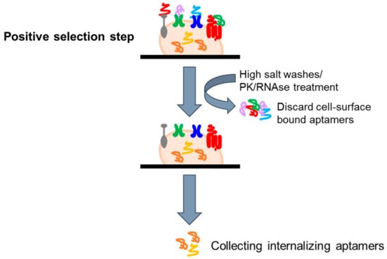 In recent years, aptamers are emerging as one of the most promising tools for the specific deliver to diseased cells of secondary reagents. Indeed, it has been shown that upon binding to their targets, aptamers can be rapidly internalized, allowing the tissue specific internalization of active therapeutic substances, including nanoparticles [35,36], anti-cancer therapeutics [37], toxins [38], enzymes [39], radionuclides [40], viruses [41], small interfering RNAs (siRNAs) [42,43,44,45,46,47,48,49,50,51,52,53,54], microRNAs, and anti-microRNAs [55,56,57]. This permits the exposition to secondary reagents only of target cells, increasing the efficacy and reducing the toxicity of the therapy. Based on these considerations, several groups have attempted to develop modified cell-based selection approaches to isolate internalizing aptamers, eliminating those sequences that do not, or very slowly, internalize (Figure 4). In this regard, Thiel et al. [53] proposed a cell-internalizing protocol based on a stringent high salt wash step to remove cell surface bound aptamers and recover only the internalized sequences. The protocol has been applied to a cell line over-expressing HER2, a transmembrane receptor over-expressed in breast cancer and associated with a poor prognosis. The authors successfully isolated RNA aptamers with high specificity for HER2-expressing breast cancer cells and with a good internalization rate. These molecules were efficiently used for the delivery of therapeutic siRNAs to HER2-expressing breast cancer cells. A variant of internalizing SELEX has been then developed in our laboratory [58]. The library coming from 13 rounds of differential cell-SELEX on U87MG cells [16] were subjected to 2 more rounds of a cell-internalization SELEX protocol based on a proteinase K (PK) treatment to remove surface-bound aptamers. The adapted strategy was aimed to preserve the glioma specificity and isolate a pool of sequences with a rapid internalization rate into GBM target cells. By such an approach, we isolated a novel internalizing aptamer (GL53) that was demonstrated to target the insulin receptor.