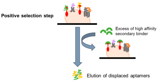 In order to select aptamers against known epitopes of interest, a variant of the basic live cell-SELEX (referred as ligand-guided selection, LIGS) has been recently developed. The protocol is based on the use of a high affinity secondary binder for the chosen target, such as a monoclonal antibody, that can compete with bound aptamers, displacing them and allowing their elution (Figure 5). In the first report, this approach has been successfully used to select aptamers against two markers on B-cell lymphoma and T cell leukemia, IgM and CD3, respectively [61,62]. The LIGS approach expands the capabilities of cell-SELEX, introducing a very simple method for a selective elution of bound aptamers. Nevertheless, its use is limited to known markers for which high-affinity secondary ligands are available.